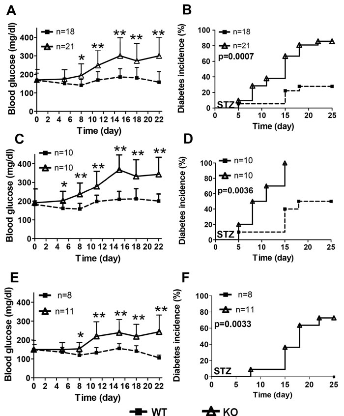 Figure 3: RIP-Cre+.HDAC3fl/fl mice are more susceptible to multiple low-dose STZ-induced (MLD-STZ) diabetes. Blood glucose levels throughout the MLD-STZ experiment were monitored and compared between KO and WT for all mice A., male mice C. or female mice E., respectively. Diabetes incidence was monitored and compared between KO and WT mice in all mice B., male mice D. or female mice F., respectively. Data are presented as means ± SD. (*p < 0.05, **p < 0.01).