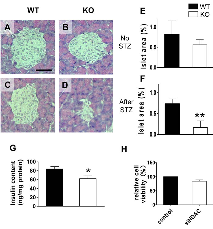 Figure 4: Histopathological analysis of islets of β-cell-specific HDAC3 KO mice. Pancreatic sections were stained with hematoxylin and eosin from WT and KO mice without STZ treatment A. and B. or 25 days after STZ injection C. and D., scale bar, 100 µm.). Islet area relative to total pancreas was evaluated and compared between KO and WT mice of untreated E., or 25 days after STZ treatment F.. n = 10-13 mice per group. Pancreatic insulin content was measure and compared between 8-12-week-old untreated KO and WT mice. n = 4-5 mice per group G.. The relative viability of Min6 cells transfected with non-targeting sequence siRNA or HDAC3-specific siRNA was compared using MTT assay H.. (*p < 0.05, **p < 0.01).