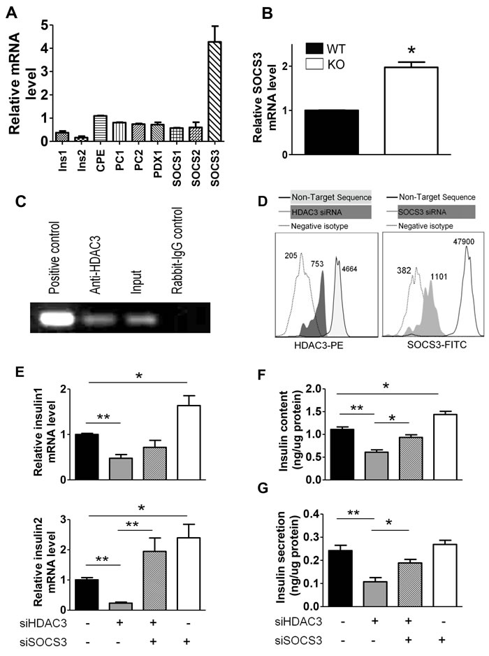 To investigate the potential molecular mechanisms involved in the insulin secretion defect of HDAC3 depleted β-cells, Min6 cells were transfected with HDAC3 siRNA. The expression of classical insulin relevant genes as well as genes involved in insulin secretory pathways and potentially regulated by HDAC3 was evaluated (Figure 5A). The mRNA level of SOCS3 was significantly increased in both HDAC3 silenced Min6 cells and islets from RIP-Cre+ HDAC3fl/fl mice (Figure 5A & 5B). To explore the potential regulatory role of HDAC3 on SOCS3, CHIP assay was performed to detect the potential binding of HDAC3 to the promoter of SOCS3. Immunoprecipitation of HDAC3 with anti-HDAC3 was able to robustly pull down the promoter of SOCS3 gene compared with rabbit IgG control antibody (Figure 5C). This result shows the direct binding of HDAC3 to SOCS3 gene, indicating the direct regulatory role of HDAC3 on SOCS3 expression. To further confirm the regulatory role of HDAC3 and the involvement of SOCS3 in HDAC3 deficiency induced β-cell dysfunction, Min6 cells were co-transfected with siRNAs against HDAC3 and SOCS3. Seventy-two hours after transfection, a flow cytometry analysis was performed to confirm the silence efficiency (Figure 5D). As expected, HDAC3 silence interrupted the transcription of both insulin1 and insulin2. In contrast, SOCS3 silence increased insulin transcription in Min6 cells. Nevertheless, HDAC3 and SOCS3 co-silence reversed the inhibitory effect of HDAC3 silence on insulin transcription, but only insulin2 mRNA change reach the statistical significant level (Figure 5E). Furthermore, in agreement with the insulin mRNA changes, SOCS3 silence elevate the insulin content, while the co-silence of SOCS3 and HDAC3 rescue the decreased insulin content and secretion induced by HDAC3 silence (Figure 5F & 5G).