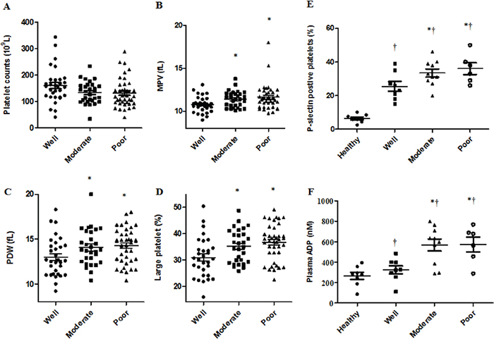 Figure 1: Elevated platelet activation and circulating ADP levels in relation to HCC patient cell differentiation status. HCC patient platelet counts were the same among the three groups A. Increasing MPV B., PDW C. and proportion of large platelets D. was observed in moderately and poorly differentiated compared with well differentiated disease. Patients with poor or moderate differentiation status had more P-selectin positive platelets and elevated ADP plasma levels compared to patients with well differentiated disease or healthy controls E & F. †P<0.05 vs. healthy controls, *P<0.05 vs. well differentiated.