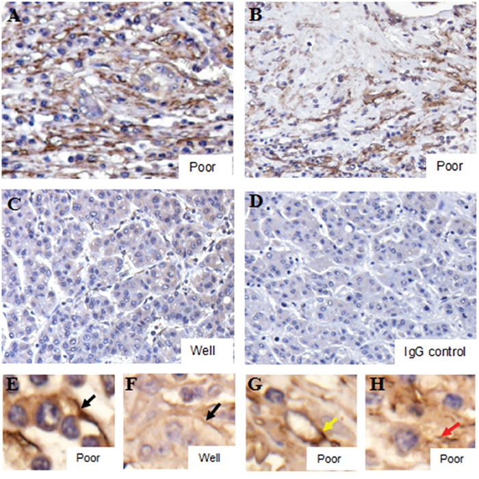 Figure 2: Platelet accumulation within HCC tissues is related to differentiation status. Poorly differentiated tissues displayed prominent IHC platelet staining A & B., with weak staining in well differentiated tissues C. Black arrows indicated co-localization of platelets and cell membranes E & F. Yellow and red arrows indicated platelets in intravascular regions G. and connective tissues H., respectively. The IgG control was shown in D.