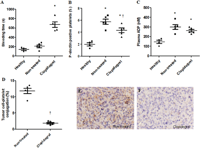 Figure 4: Anti-platelet intervention abolished tumor cell-evoked platelet activation, accumulation and binding in the mouse xenograft model. Mice were injected with HepG-2 cells and one group was treated with clopidogrel. Tail bleeding time was measured in mice with or without treatment A. Increased P-selectin expression by circulating platelets, plasma ADP level and platelet-tumor cell binding were observed in xenograft mice and were inhibited by clopidogrel treatment B–D. Clopidogrel treatment prevented platelet accumulation in mouse tumor tissues E & F. *P<0.05 vs. healthy controls, †P<0.05 vs. non-treated, n=5/group.