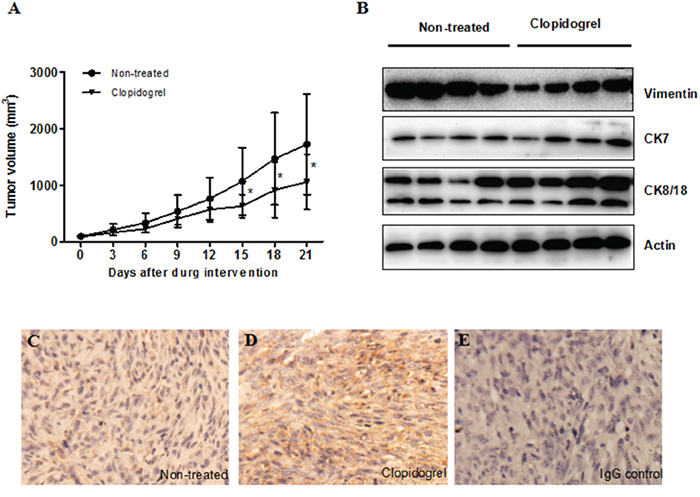 Figure 5: Anti-platelet intervention induced cell differentiation in the mouse xenograft model. Tumor volume was measured every two days in both control and clopidogrel-treated mice A. Differentiation marker expression was analyzed by western blotting B. or IHC C & D. The IgG control was shown in E.