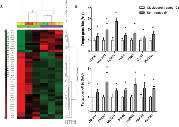 Figure 6: Microarray analysis in xenograft tumors from control and clopidogrel-treated mice. An unbiased microarray expression profiling heat map between control and clopidogrel-treated mice was shown. High and low expression were indicated in red and green, respectively A. mRNA levels of 14 candidate genes in mouse tumor samples were verified with real-time PCR B. *P<0.05 vs. clopidogrel-treated.