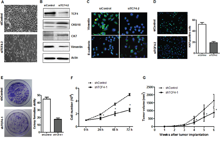 Figure 7: TCF4 knockdown induced cell differentiation and decreased tumorigenicity. Phase contrast images of HepG-2 cells transfected with either siControl or siTC4 A. Differentiation marker expression was analyzed by western blotting B. or IF C. Cell proliferation was assessed by Ki-67 IF staining D., proliferation assay E. and colony formation assay F. ShTCF4- or shControl-transfected cells were injected into NOD/SCID mice subcutaneously and tumor volumes were recorded G. *P<0.05 vs. control.