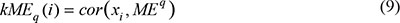 The module membership (also known as module eigengene based connectivity, kME) of each gene was calculated by correlating the gene expression profile with module eigengenes with formula 9, in which xi is the gene expression profile of gene i and MEq is the module eigengene of the module q [57].