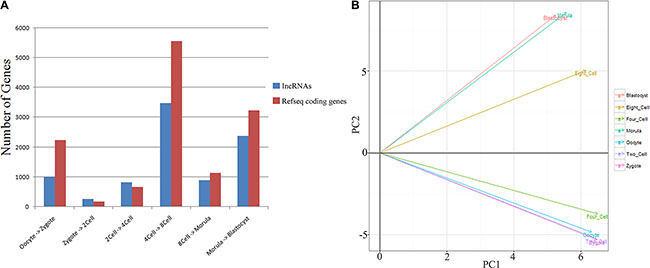 Figure 2: Global gene expression patterns during the seven consecutive stages of human pre-implantation development. (A) Bar graph showing the total number of differentially expressed genes between successive developmental stages (q-value < 0.01 and log2 fold change > 1). (B) Principal component (PC) analysis based on lncRNA expression profiles of human pre-implantation embryos.