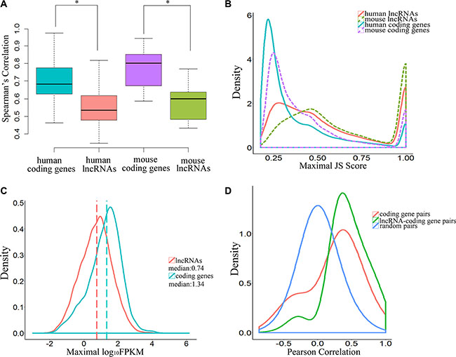 Figure 3: Temporal-specific expression of lncRNAs. (A) Boxplot indicating the distribution of Spearman’s rank correlation coefficients between each embryonic sample pair derived from lncRNAs and coding genes (* means P-value < 0.05). (B) Distribution of JSD-based specificity of genes in various stages. (C) Distribution of maximal expression (log10-normalized FPKM counts estimated by Cufflinks) of lncRNAs and coding genes in human pre-implantation development. (D) Pearson correlation coefficient distributions for expression levels across the samples in human pre-implantation development. The random pairs are 10,000 random pairs of protein-coding genes.
