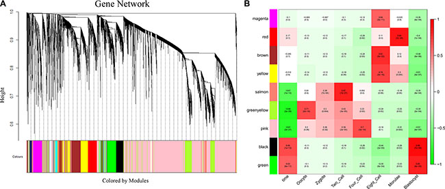 Figure 4: Network analysis of human pre-implantation development. (A) Hierarchical cluster tree showing co-expression modules identified using WGCNA. Modules correspond to branches and are labeled by colors as indicated by the color band underneath the tree. (B) Heatmap of correlations followed by the P-values in parentheses between modules and developmental stage. The color of each square corresponds to the degree of correlation: positive correlation, red; negative correlation, green; no correlation, white. The “time” column on the left represents the correlation of each module with the entire development process.