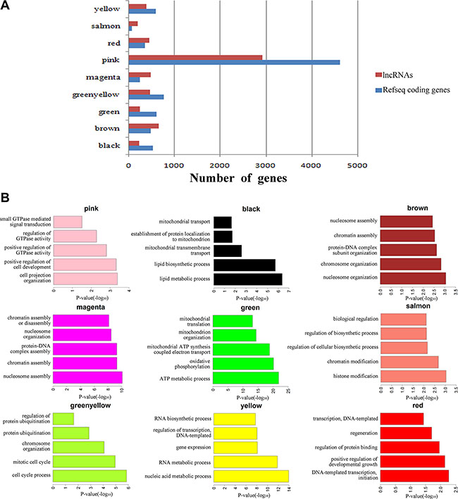 Figure 5: Function prediction of lncRNAs involved in pre-implantation development. (A) Bar graph showing the number of lncRNAs and coding genes in each module. (B) Bar plots showing GO enrichment in the modules. The length of the bars indicates the significance.