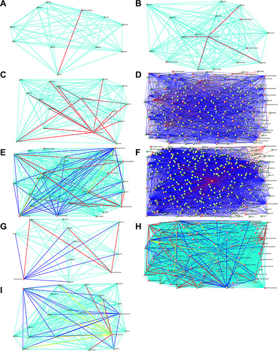 Figure 6: Hub gene networks for human stage-specific modules. Visualization of gene-gene interactions within each module. The connections were drawn using the VisANT tool. The genes with at least one connection when the weighted cutoff value was ≥ 0.1 are shown. Each node represents a hub gene. The red nodes are hub lncRNAs. The green edges mean co-expression, and the red edges mean both co-expression and interaction, and the blue edges mean both co-expression and neighbor gene, and the yellow edges mean all three situation (co-expression, interaction and neighbor gene). To make the background clear, the green edges are not shown in Figure D and F. (A) Black module. (B) Brown module. (C) Green module. (D) Greenyellow module. (E) Magenta module. (F) Pink module. (G) Red module. (H) Salmon module. (I) Yellow module.
