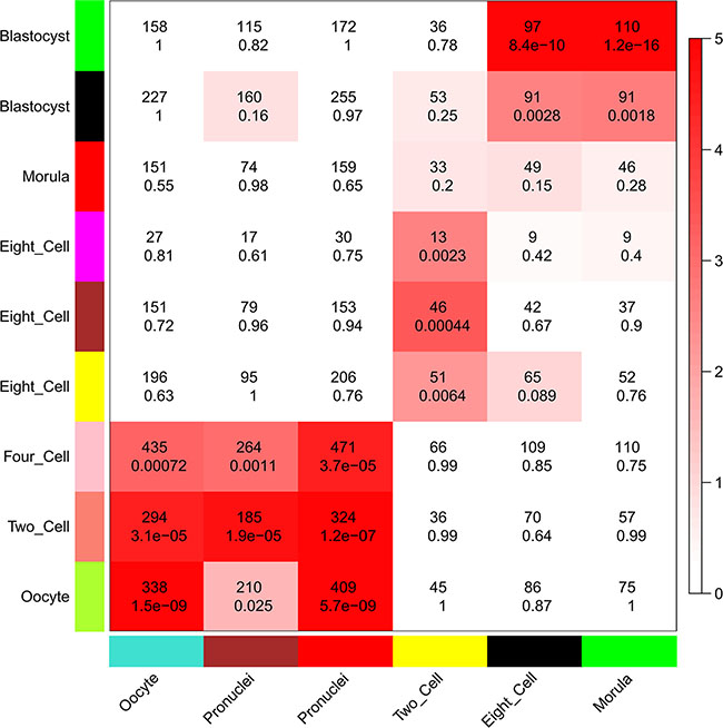 Figure 7: Comparison of modules in human and mouse early embryonic development. Heatmap showing the significance of gene overlaps between independently constructed human and mouse modules. The x axis shows only mouse stage-specific modules (n = 6), and the y axis shows all human modules (n = 9). Each cell contains the number of intersecting genes and the P-value of the intersection. Color legend represents −log10–transformed P-values based on a hypergeometric test.