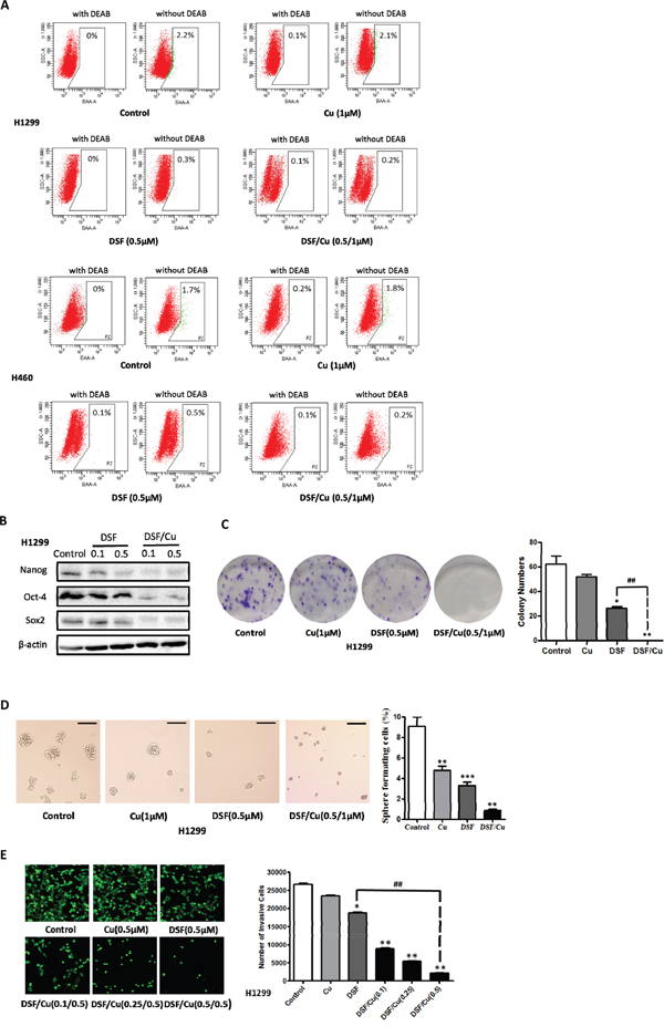 Figure 2: DSF/Cu inhibits the stemness of NSCLCs in vitro. A. Inhibitory effect of DSF (0.5 μM), Cu (1 μM) and DSF/Cu (0.5/1 μM) on the ALDH-positive cell population from the NSCLC cells lines H1299 and H460. B. DSF (0.1 μM, and 0.5 μM) and DSF/Cu (0.1/1 μM, and 0.5/1 μM) inhibit the expression of the stem cell transcription factors Nanog, Sox2 and Oct-4 expression in H1299 cells. C. Inhibitory effect of DSF (0.5 μM), Cu (1 μM) and DSF/Cu (0.5/1 μM) on the colony forming ability of H1299 cells (*P < 0.05, **P < 0.01, ##P < 0.01, one-way ANOVA). D. Inhibitory effect of DSF and DSF/Cu on tumorsphere formation. Tumorspheres were incubated with DSF (0.5 μM), Cu (1 μM) and DSF/Cu (0.5/1 μM) for 7 days. Scale bar, 100 μm. (**P < 0.01, ***P < 0.001, one-way ANOVA). E. Inhibitory effect of DSF/Cu on transwell invasion assay. Cells were incubated with DSF (0.5 μM), Cu (0.5 μM) and DSF/Cu (0.1/0.5 μM, 0.25/0.5 μM and 0.5/0.5 μM) in transwells for 24 hours (*P < 0.05, **P < 0.01, one-way ANOVA).