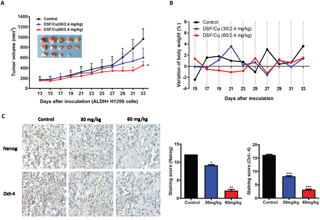 Figure 3: DSF/Cu inhibits ALDH-positive NSCLC stem cells in vivo. A. DSF/Cu decreases the size of tumors derived from ALDH-positive NSCLC xenografts. Images of the tumors that developed in NOD/SCID mice from each treatment group are also shown. (*P < 0.05, one-way ANOVA). B. DSF/Cu has no apparent toxicity as determined by body weight. C. Representative images of immunohistochemical staining of tumor tissue for the stem cell transcription factors Nanog and Oct-4. The staining intensity was scored as 0 (negative), 1 (weak), 2 (medium) and 3 (strong). Extent of staining was scored as 0 (0%), 1 (1-25%), 2 (26-50%), 3 (51-75%) and 4 (76-100%), according to the percentage of the positively stained areas in relation to the whole carcinoma area (*P < 0.05, **P < 0.01, ***P < 0.001, one-way ANOVA).