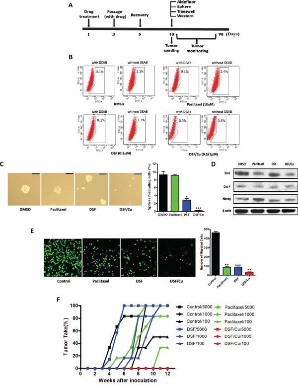 Figure 4: Effects of DSF/Cu pretreatment on NSCLC stem cell numbers in vitro and tumor seeding in vivo. A. Schematic representation of treatment scheme. Cells were pretreated with drugs, then allowed to recover before experimental testing. B. Inhibitory effect of drug pretreatment on ALDH-positive cell populations before inoculation. C. Inhibitory effect of drug pretreatment on tumorsphere formation. Scale bar, 50 μm. (*P < 0.05, ***P < 0.001, χ2 test). D. Inhibitory effect of drug pretreatment on the expression of stem cell transcription factors. E. Inhibitory effect of drug treatment on transwell migration assays (**P < 0.01, ***P < 0.001, one-way ANOVA). F. Latency periods and tumor take percentage in xenograft mice receiving cells pretreated with the indicated drugs.
