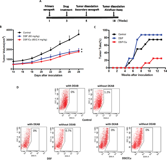 Figure 5: Effects of DSF and DSF/Cu treatment in vivo and tumor growth on secondary xenografts. A. Schematic representation of the treatment scheme. B. Drug treatment reduces the size of primary xenograft tumors (*P < 0.05, 2-tailed t test). C. Percentage of tumor take and latency period in mice receiving secondary xenografts from each treatment group. D. Percentage of ALDH-positive cells in secondary xenograft tumors from each treatment group.