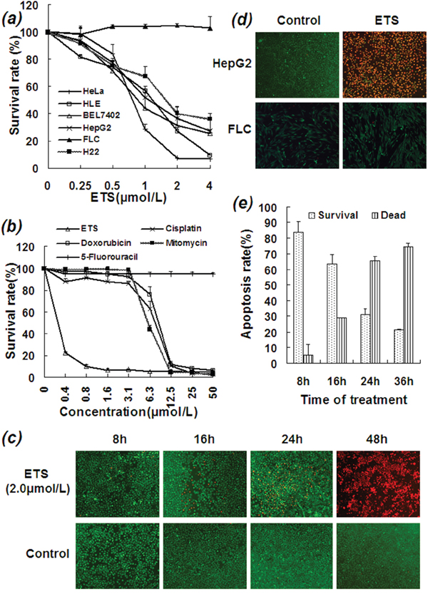 Figure 1: Inhibitory and killing effects of ETS on HCC cells. a. Various cancer cell lines were cultured in the absence or presence of ETS at indicated concentrations for 48 h. b. HepG2 cells were cultured in the absence or presence of various drugs at indicated concentrations for 48 h. c. HepG2 cells were cultured in the presence and absence of ETS for indicated hours and then treated with LIVE/DEAD* Viability/Cytotoxicity Kit for detection of viable and dead cells. The killing effect of ETS is time-dependent with the majority of HepG2 cells were killed by ETS at 48 hours. d. The cells were fluorescently double-stained with Calcein-AM (1 μmol/L) and EthD-1 (2 μmol/L) at 37°C for 30 min and then surveyed under fluorescence microscope. Cells emitting green fluorescence were viable cells which were merely stained by Calcein-AM. Cells emitting red fluorescence were dead cells or apoptotic cells which merely stained by EthD-1. Upper panel: HepG2 HCC cells were treated with ETS at a concentration of 2 μmol/L for 48 h. The vast majority of HepG2 cells were killed by ETS. Lower panel: human fetal liver cells were treated with ETS at a concentration of 25 μmol/L for 48 h. None of fetal liver cells were killed by ETS. e. HepG2 cells were treated with ETS at a concentration of 2 μmol/L for 8, 16, 24 or 36 hours. The apoptotic cells were measured by Flow-cytometry. The dying cells including at early and late apoptotic phases were calculated together. The promoting effect of ETS on apoptosis of HepG2 cells was time-dependent. The experiment was repeated several times.