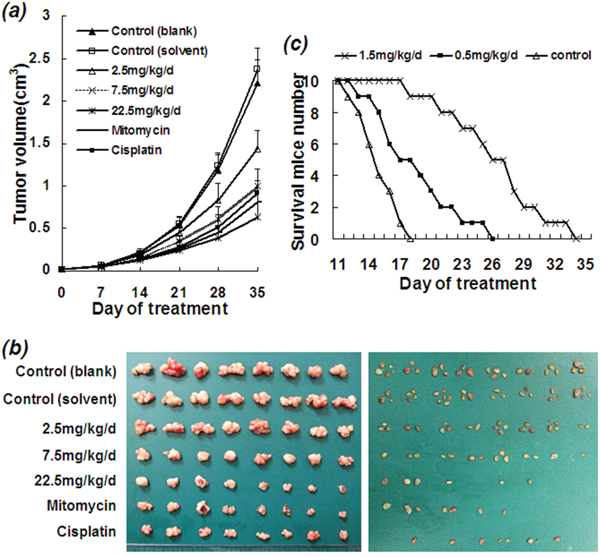 Healthy female BALB\c-nude mice (n=56, weight 18-22g) were subcutaneously inoculated with human HCC Bel-7402 cells (1 × 106) at the foreside on back, then stochastically divided into 7 group: ETS (22.5, 7.5, 2.5 mg/kg/d), cisplatin (1.0 mg/kg/d), mitomycin (1.0 mg/kg/d), solvent control and blank control (PBS), respectively. Each group contained 8 mice. ETS, cisplatin, mitomycin were intraperitoneally administered by injection from the day 9 after inoculation of Bel-7402 cells when the tumor grew out. Tumor volume was measured twice a week. Tumor volume=1/2 × tumor length × tumor width2. Inhibitory rate of tumor = (mean tumor weight of control - mean tumor weight of treated mice) / mean tumor weight of control × 100%.