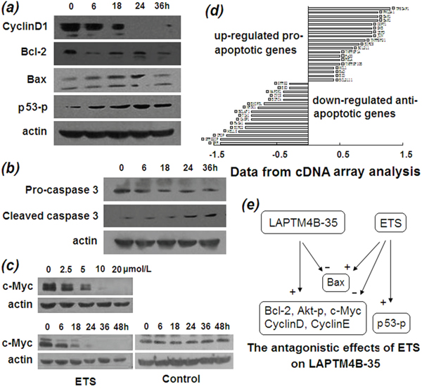Figure 3: Molecular alterations induced by ETS. a. Western blot profiles of cyclin D1, Bcl-2, Bax, and phosphorylated p53 proteins from lysate of HepG2 cells incubated in the presence of ETS (2 μmol/L) for indicated times, indicating that proliferation- and apoptosis-related proteins are altered by ETS in a time-dependent manner. b. Western blot profile of procaspase 3 and cleaved caspase 3 from lysate of HepG2 cells incubated in the absence and presence of ETS (2 μmol/L) for indicated times, indicating the activation of key effector molecule by ETS in apoptotic pathway. c. Western blot profile of c-Myc protein from lysate of HepG2 cells incubated in the absence and presence of ETS at indicated concentrations for indicated hours, indicating remarkable decrease of c-Myc protein with ETS treatment in a dose- and time-dependent manner. d. cDNA array analysis shows the upregulated and downregulated genes that promote and inhibit apoptosis, respectively, by treatment of ETS. e. Schematic representation of antagonistic effects of ETS on gene expression that had been induced by overexpression of LAPTM4B-35 in HCC.