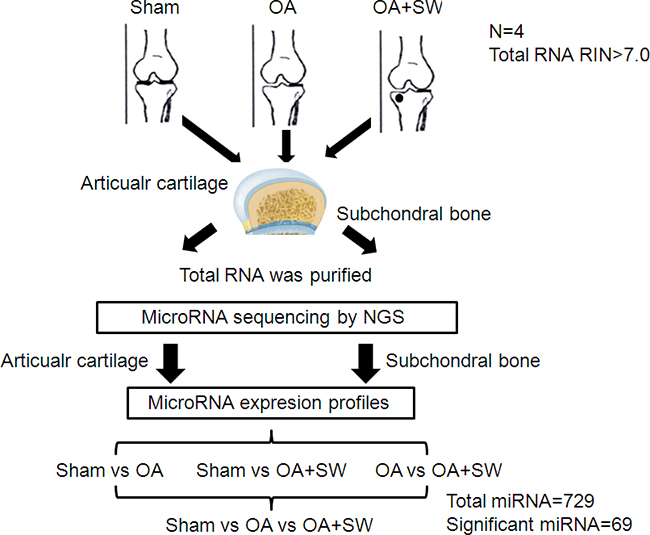 Figure 1: Experimental design. Twelve rats were divided in three groups such as sham, osteoarthritis (OA) and OA with shockwave (SW). The miRNA from sham, OA and OA+SW cartilage and bone samples were purified and then were sequencing by NGS. Four comparisons were used to analysis the expression of miRNA. The 729 miRNAs were analysis and 69 miRNAs were significant in our experiment. The black circle was the site for shockwave treatment.