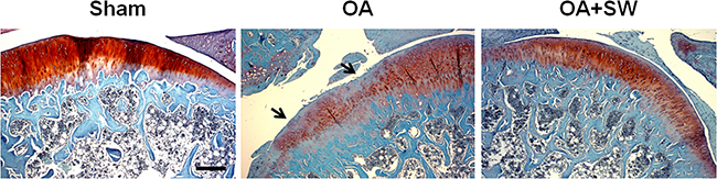 Figure 2: The histologic analysis of cartilage and subchondral bone in a rat model of early OA. Safranin O staining of sagittal sections of the tibia medial compartment and proteoglycan of cartilage (red) and subchondral bone (blue) was shown. Black arrows indicated loss of proteoglycan at 4 weeks post-surgery. Scale bar, 50 µm.