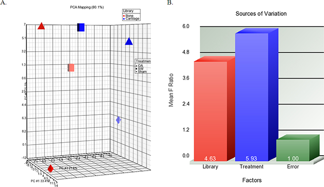 Figure 4: The profile of overall miRNAs expression changes. A. The differential expression levels of miRNA in library (bone and cartilage) versus treatment groups (sham, OA and OA+SW). Each shape in the 3D visualization represents a group of miRNAs. Principal component analysis (PCA) captured 80.1% of the variation observed in the experiment in the first three principal components (PC). B. The source of the variation plot showed that the expression of miRNA in treatment groups of factor accounted for major of the variation.