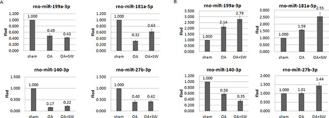 Figure 5: MiRNA expression patterns were evaluated by Quantitative RT-PCR. The rno-miR-199a-3p, rno-miR-181a-5p, rno-miR-140-3p and rno-miR-27b-3p were measured from articular cartilage A. and subchondral bone B. The expression profiles of each miRNA matched the tested probes at least three times repeat. The values were the mean and SEM of the miRNA expression levels in 4 animals, as determined by ΔCt analysis, normalized to GAPDH expression, and relative to the expression levels of sham control. ** p<0.01 (versus sham control).