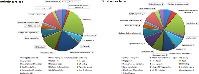 Figure 6: Molecular functions of predicted target genes of miRNAs differentially expressed in articular cartilage and subchondral bone. The diagrams of A. articular cartilage and B. subchondral bone showed the proportion of modulated miRNAs target genes belonging to the most significant functional annotations derived from the UniProt database.