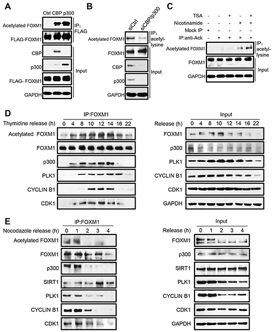 Figure 1: FOXM1 is acetylated by CBP/p300 in vivo. A. Cell extracts from HEK293T cells co-transfected with FLAG-FOXM1, CBP or p300 were immunoprecipitated with anti-FLAG antibody and analyzed by western blotting with anti-acetylated lysine, and anti-FLAG antibodies. B. HEK293T cells were transfected with p300 siRNA and CBP siRNA. The cells were subjected to immunoprecipitation with anti-acetyl-lysine antibody. Immunoprecipitated complexes were used for western blot analysis with anti-FOXM1 antibody. C. Whole-cell lysates from HEK293T cells treated with 1 uM TSA or 5 mM nicotinamide alone or in combination were immune-precipitated with control IgG or anti-acetyl-lysine antibody. Endogenous acetylated FOXM1 was analyzed by western blotting with anti-FOXM1 antibody. D. U2OS cells were synchronized at the G1/S boundary by double thymidine block, then released into fresh medium, and harvested at the indicated time points (hours). The levels of the indicated proteins were determined by western blotting (right panel). Equal amounts of cell extracts were immunoprecipitated using anti-FOXM1 antibody and analyzed by western blotting with the indicated antibodies (left panel). E. U2OS cells were arrested by 300 ng/ml of nocodazole for 16 h. The partially detached arrested cells were shaken-off and washed three times with PBS before being plated to allow re-entry into the cell cycle. Cell extracts were collected at indicated time points and immunoprecipitated with anti-FOXM1 followed by western blot analysis (left panel). Input samples were analyzed by immunoblotting with antibodies as indicated (right panel).