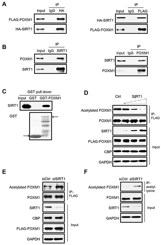 Figure 2: FOXM1 is deacetylated by SIRT1 in vivo. A. HEK293T cells were transfected with HA-SIRT1 and FLAG-FOXM1. Cell extracts were subjected to immunoprecipitation using IgG as a control or HA or FLAG antibody followed by western blotting with antibodies against HA and FLAG. 5% of cell lysates were used as input. B. Cell extracts from HEK293T were immunoprecipitated with SIRT1 or FOXM1 or IgG antibody and analyzed by Western blotting with FOXM1 and SIRT1 antibody. The input lanes represent 5% of the total volume of whole-cell extracts used for the binding assay. C. Association between SIRT1 and FOXM1 in vitro. In vitro translated SIRT1 were incubated with GST or GST-FOXM1. CBB staining was used to show the GST-fusion protein levels. D. HEK293T cells were cotransfected with plasmids that express FLAG-FOXM1, CBP, and increasing amounts of SIRT1. Whole-cell lysates were immunoprecipitated with anti-FLAG antibody and analyzed by western blotting with anti-acetylated lysine and anti-FOXM1 antibodies. E. HEK293T cells were cotransfected with FLAG-FOXM1, CBP, and control siRNA or SIRT1 siRNA. Whole-cell lysates were immunoprecipitated with anti-FLAG antibody and analyzed by western blotting with anti-acetylated lysine, anti-FLAG. F. HEK293T cells were transfected with control siRNA or SIRT1 siRNA. Whole-cell lysates were immunoprecipitated with anti-acetyl-lysine antibody, and endogenous acetylated FOXM1 was detected with anti-FOXM1 antibody.