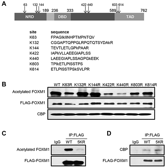 We next sought to identify the potential acetylation sites of FOXM1 by performing mass spectrometry analyses of acetylated FOXM1 proteins. Seven lysines were found to be acetylated by CBP (Figure 3A). To further confirm the major acetylation sites, we generated arginine to lysine substitution mutants at these seven lysines: K63R, K132R, K144R, K422R, K440R, K603R and K614R respectively. HEK293T cells were transfected with either FOXM1-WT or various FOXM1 mutants together with CBP. We observed that – whereas both FOXM1-K132R and FOXM1-K144R constructs were almost acetylated to the same extent as the wild-type FOXM1 protein – FOXM1-K63R, K422R, K440R, K603R, and K614R substitutions were acetylated at a significantly lower level by CBP (Figure 3B). This indicates that K63, K422, K440, K603 and K614 of FOXM1 were the major acetylation sites of FOXM1. Therefore, we simultaneously mutated these five lysines within FOXM1 to produce an acetylation-deficient mutant. As predicted, this mutation (5KR-FOXM1) almost completely abolished the acetylation of FOXM1 in cells overexpressing CBP (Figure 3C). This is a direct result of the mutated lysine rather than a defect in the binding of this mutant to CBP, as FOXM1-5KR bound to CBP at a similar level as the FOXM1-WT (Figure 3D). Altogether, these results indicate that the major acetylation sites of FOXM1 lie at lysines 63, 422, 440, 603 and 614.