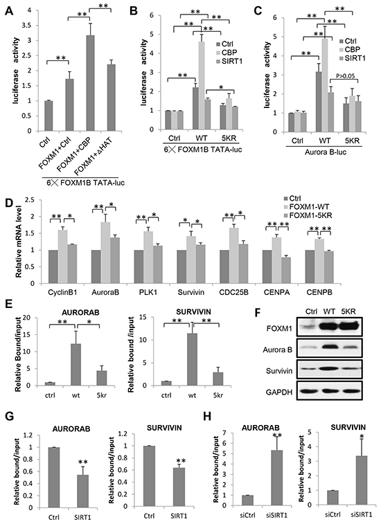 Figure 4: Acetylation Is Required for FOXM1 Transcriptional Activity. A. Effect of CBP acetyltransferase activity on FOXM1-mediated transcription. U2OS cells were transfected with FOXM1, a luciferase reporter containing six FOXM1 DNA binding domains together with either CBP WT or CBP HAT, and the luciferase activity was measured. B. U2OS cells were cotransfected with an empty vector, FLAG-FOXM1 wild-type, or FLAG-FOXM1 5KR, a luciferase reporter containing six FOXM1 DNA binding domains together with CBP or SIRT1. Cells were lysed in reporter lysis buffer 48 h after transfection, and luciferase activity were measured. Results are representative of three independent experiments; the error bars indicate the SD from the average. C. U2OS cells were cotransfected with an empty vector, FLAG-FOXM1 wild-type, or FLAG-FOXM1 5KR, a luciferase reporter containing the Aurora B promoter region together with CBP or SIRT1 and the luciferase activity was measured. D. Quantitative PCRs were performed on U2OS cells transfected with FLAG-FOXM1 wild-type or FLAG-FOXM1 5KR. The average expression levels of triplicates were normalized for the expression levels of the housekeeping gene GAPDH. E. ChIP analysis of FOXM1 enrichment on Aurora B or Survivin promoter was performed in cells transfected with FLAG-FOXM1 wild-type or FLAG-FOXM1 5KR. Data represent the mean ± s.d. for triplicate experiments. F. Protein lysates from U2OS cells transfected with an empty vector, FLAG-FOXM1 wild-type or FLAG-FOXM1 5KR were analyzed by western blotting with the antibodies indicated. G. ChIP analysis of FOXM1 enrichment on Aurora B or Survivin promoter was performed in cells transfected with ctrl or SIRT1. Data represent the mean ± s.d. for triplicate experiments. H. ChIP analysis of FOXM1 enrichment on Aurora B or Survivin promoter was performed in cells transfected with siCtrl or siSIRT1. Data represent the mean ± s.d. for triplicate experiments. *P<0.05; **P<0.01.