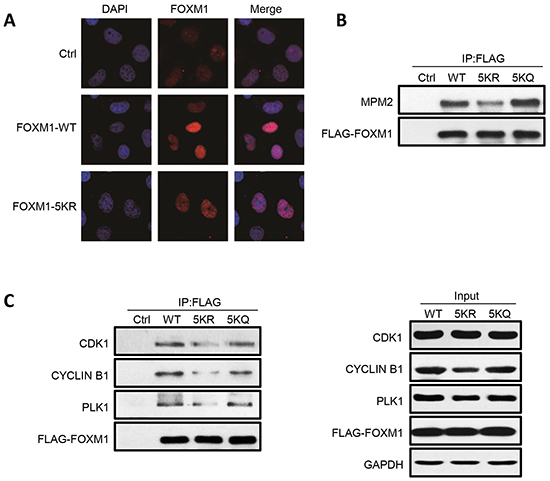 It is well established that FOXM1 becomes progressively phosphorylated throughout cell cycle in ERK- and CDK1-dependent manners, which leads to FOXM1 nuclear localization and activation [20-25]. We first investigated if acetylation of FOXM1 can change its localization; FLAG-FOXM1-WT or FLAG-FOXM1-5KR were transfected into U2OS cells. Immunofluorescent staining demonstrated identical patterns of localization, indicating that the acetylation of FOXM1 had no effect on its nuclear localization (Figure 5A). We further examined whether acetylation has an impact on FOXM1 phosphorylation mediated by CDK1/cyclin B1. U2OS cells were transfected with FLAG-FOXM1-WT, FLAG-FOXM1-5KR, or FLAG-FOXM1-5KQ. Phosphorylated FOXM1 were analyzed by western blot with MPM-2 antibody, an M-phase-specific anti-phospho-Ser/Thr-Pro antibody that recognizes FOXM1. The basal phosphorylation of FOXM1 in the FLAG-FOXM1-5KR mutant was significantly low compared to FOXM1-WT (Figure 5B, lane 3 versus lane 2). However, FOXM1-5KQ – which mimics the hyperacetylated FOXM1 – showed high levels of phosphorylation similar to FOXM1-WT (Figure 5B, lane 4 versus lane 2). This result suggests that there is an interdependency between the acetylation and phosphorylation of FOXM1. To clarify the relevance between FOXM1 acetylation and phosphorylation, we further examined whether acetylation increased the binding between FOXM1 and CDK1/cyclin B1 and PLK1, proteins that reportedly play essential roles in the phosphorylation of FOXM1. A significantly decreased interaction between the FOXM1-5KR mutant and CDK1, cyclin B1, and PLK1 was detected, compared to FOXM1-WT (Figure 5C, lane 3 versus lane 2), whereas the interaction between FOXM1-5KQ and these three proteins showed similar levels to FOXM1-WT (Figure 5C, lane 4 versus lane 2). Altogether, these results demonstrated that FOXM1 acetylation is necessary for the optimal binding between FOXM1 and CDK1, and further contributes to its phosphorylation.