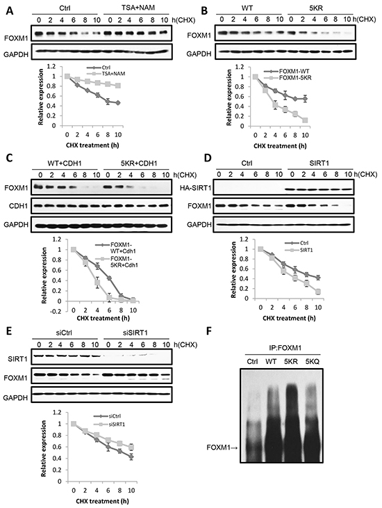 Since the acetylation of FOXM1 enhances its transcriptional activity (Figure 4) without changing its localization (Figure 5A) – outside of increasing DNA binding (Figure 4E) – our new inquiry questions whether or not acetylation can participate in the regulation of FOXM1 stability. Following cycloheximide treatment to inhibit protein translation, we observed that the half-life of FOXM1 in TSA and NAM-treated cells was greatly prolonged compared with that observed in non-treated cells (Figure 6A). Consistently, FOXM1-5KR degraded more quickly than FOXM1 (Figure 6B). These results suggested that acetylation was involved in the degradation of FOXM1. Since FOXM1 had been reported to be degraded by the APC/Cdh1 complex during anaphase [41], we wondered whether acetylation had an effect on FOXM1 degradation by the APC/Cdh1 complex. U2OS cells were co-transfected with cdh1 and the WT or 5KR FOXM1, followed by half-life measuring. We found that the co-expression of Cdh1 significantly shortened the half-life of 5KR FOXM1 to a much larger extent than WT FOXM1 following cycloheximide treatment (Figure 6C). Consistently, the overexpression of SIRT1 significantly decreased the half-life of the endogenous FOXM1 (Figure 6D), whereas SIRT1 depletion increased its half-life (Figure 6E). Consistent with previous observations, 5KR-FOXM1 showed higher levels of ubiquitination compared to WT-FOXM1, whereas FOXM1-5KQ was ubiquitinated to an extent similarly to FOXM1-WT (Figure 6F). This supports the idea that acetylated FOXM1 is more resistant to ubiquitination and degradation. Together, we concluded that the acetylation of FOXM1 increases its stability through ubiquitination.