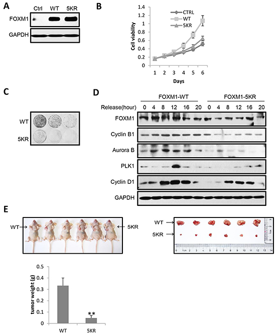 Since FOXM1 was frequently overexpressed in a broad spectrum of human cancers, we further investigated the effect of FOXM1 acetylation on malignant growth potential. We first established HeLa cell lines stably expressing proteins of control, FOXM1-WT, or FOXM1-5KR, and then monitored their phenotypic changes. All three FOXM1 reconstituted cells had similar ectopic FOXM1 expression levels (Figure 7A). The MTT growth curve revealed reduced viability in cells expressing FOXM1-5KR compared to cells expressing FOXM1-WT (Figure 7B). Consistently, crystal violet staining assay indicated that HeLa cells stably expressing FOXM1-5KR displayed markedly suppressed colony-forming ability compared to cells expressing FOXM1-WT (Figure 7C). To further investigate the effect of FOXM1 acetylation in the cell cycle progression, we examined the expression of cell cycle regulatory proteins following double thymidine block and release in HeLa cells stably expressing FOXM1-WT or FOXM1-5KR proteins. Intriguingly, expression of FOXM1-5KR caused a reduction of cyclin B1, Aurora B, PLK1 and cyclin D1 expression compared to FOXM1-WT (Figure 7D). To address the importance of acetylation in regulating the growth of cancer cells, we subcutaneously injected the immune-deficient nude mice with HeLa cells stably expressing FOXM1-WT or FOXM1-5KR. Expression of FOXM1-WT cells grew large tumors within five weeks, whereas a significant inhibition of tumor growth was observed in the same mice injected with FOXM1-5KR expression cells (Figure 7E), which was consistent with the results showed in the MTT growth curve and crystal violet staining assay. Collectively, these data underscore an essential role of acetylation in FOXM1 mediated cell proliferation, cell cycle progression, and tumorigenic activities.