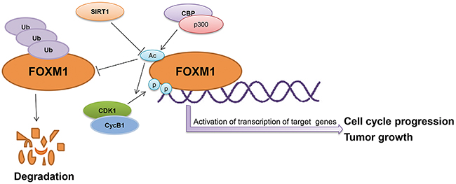 The FOXM1 transcription factor plays a significant role in the regulation of a multitude of biological processes, including cell proliferation, oxidative stress, angiogenesis, cancer development, and drug resistance [5-8]. Understanding the regulation of FOXM1 will provide new clues for the identification of reliable and novel therapeutic targets for cancers. In this study, we demonstrated that acetylation and deacetylation play an important role in regulating FOXM1 expression and function. We found that FOXM1 is acetylated by CBP/p300 at lysines 63, 422, 440, 603, and 614. This acetylation is counteracted by SIRT1 during cell cycle progression. Acetylation of FOXM1 potentiates its transactivation function and contributes to cell cycle progression, cell proliferation, and tumorigenesis. Furthermore, we found that SIRT1 serves as a negative cofactor for FOXM1-dependent transcription through its deacetylase activity (Figure 8).