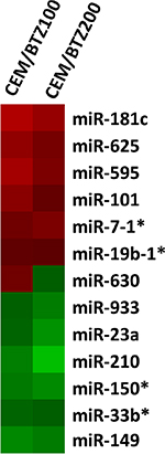 Figure 1: Differential miRNA expression between BTZ-resistant CEM cells and CEM/WT. Red color represents upregulation, green color downregulation.