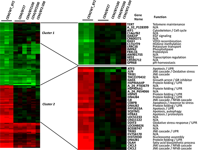 Figure 2: Top 50 upregulated and top 50 significantly down-regulated genes (p < 0.05) comparing CEM/WT_BTZ (CEM/WT cells incubated for 24 hrs with 7 nM BTZ) to CEM/BTZ7 (CEM cells resistant to 7 nM BTZ). The figure depicts this selection of genes for all CEM variations as a ratio of the untreated CEM/WT cells. (Clustering performed using Cluster 3.0) An overview of top 50 upregulated and top 50 down-regulated genes is depicted. For genes in cluster 1 and cluster 2, gene annotation and function are provided.
