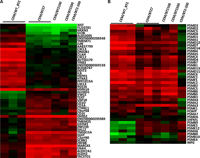 Figure 3: (A) Top 20 up- and downregulated genes (p < 0.05) and (B) proteasomal genes comparing CEM/WT_BTZ with CEM/BTZ7 (p < 0.05). Results for all CEM variations are depicted as a ratio of the untreated CEM/WT. Red color represents upregulation, whereas green downregulation of expression.