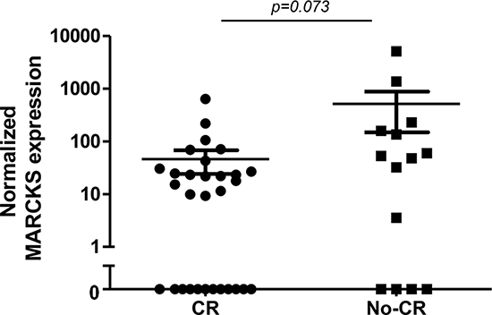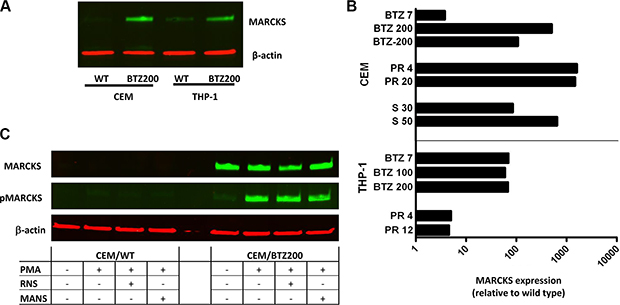 The list of upregulated genes contains several genes encoding for enzymes involved in detoxification (including ALDH7A1, ALH2, GSTM3 and DHRS2), CD1 genes (CD1A, CD1D and CD1E), the cell cycle gene TERT and several genes involved in cytoskeleton regulation and vesicle migration (ENAH, SCRN1 (SES1), SGEF, TMSB15A, C9orf58 (AIF1L) and MARCKS. Of all genes, MARCKS (myristoylated alanine-rich C-kinase substrate) was the most differentially overexpressed gene with a 25- to 42-fold upregulation in the BTZ-resistant leukemia cell lines.