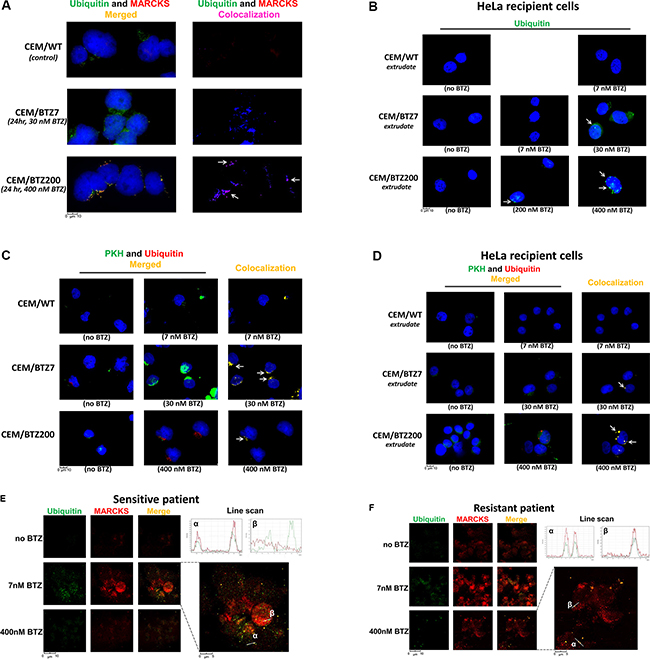 The proteasome inhibitor Bortezomib (BTZ, Velcade®) is registered for the treatment of multiple myeloma (MM) and mantle cell lymphoma [1, 2] and is currently undergoing clinical evaluation in other hematological malignancies, such as pediatric acute leukemia [3]. Through reversible inhibition of the chymotrypsin-like activity of the β5 subunit and to a lesser extent the caspase-like activity of the β1 subunit of the 20S proteasome, BTZ specifically blocks proteasomal degradation of ubiquitinated proteins [4, 5]. Consequently, misfolded and poly-ubiquitinated proteins accumulate thereby activating the unfolded protein response (UPR) [6, 7]. The balance between protein production and the extent of degradation inhibition plays a key role in the cytotoxic activity exerted by BTZ [7]. Moreover, inhibition of multiple pro-survival pathways [8–13] contribute to the BTZ induced apoptosis. Despite the proven efficacy of BTZ, development of drug resistance is an emerging obstacle [14]. Although the mechanism underlying BTZ resistance in hematological malignancies is only partly understood, several proteasomal and non proteasomal-related factors involved in BTZ resistance have been suggested [14–17]. With respect to the latter, upregulation of heat shock proteins [18–20], drug extrusion by P-glycoprotein [21–23], upregulation of P21(WAF1/CIP1) [24], activation of the AKT/mTOR pro-survival pathway [25], downregulation of XBP1s [26], decreased CIP2A activity [27] and Noxa/Bcl-2 protein interactions [28] have been suggested to be implicated in BTZ-resistance. Proteasome-related mechanisms of BTZ resistance are associated with differential upregulation of β5 subunit along with downregulation of immunoproteasome subunit [21, 29–34]. Specifically, in acute leukemia cell lines and childhood ALL and AML leukemic blast cells, a lower ratio of immunoproteasome subunits over constitutive subunits was associated with a decreased sensitivity to BTZ [35]. Remarkably, reversing this balance towards increased immunoproteasome subunits upon treatment with interferon-γ exposure restored BTZ sensitivity in BTZ-resistant leukemic cells [31]. Moreover, acquisition of PSMB5 mutations and upregulation of mutated β5 subunits were frequently identified in hematological tumor and various solid tumor cell lines which conferred high levels of BTZ resistance in vitro [14, 17, 21, 29, 32, 36–39]. The identified mutations in PSMB5 form a cluster in a region that encodes for critical amino acids within or in close proximity to the BTZ- binding pocket of the β5 subunit resulting in decreased BTZ binding [29, 40]. Next generation proteasome inhibitors displayed differential capacities to overcome BTZ in hematological cells, but appeared themselves prone to the development of drug resistance by mechanisms including PSMB5 mutations [41, 42]. A currently open question is how BTZ-resistant cells harboring PSMB5 mutations handle proteolytic stress upon exposure of increasing BTZ concentrations. Examining the ability of BTZ to inhibit the catalytic activity of the mutated β5 subunit revealed a 2-fold lower potency as compared to non-mutated β5 subunits, whereas the cell growth inhibitory capacity was repressed by a factor of > 100 fold [29, 41]. These findings suggest that BTZ resistant cells acquired additional compensatory mechanism(s) to cope with the proteolytic stress. To gain further insight into these underlying molecular mechanisms, we undertook a multi-modality (DNA, mRNA, miRNA) array-based analysis of human CCRF-CEM leukemia cells and two subclones harboring PSMB5 mutations, one with a moderate and one with a high level BTZ resistance. These studies revealed a highly upregulated myristoylated alanine-rich C-kinase substrate (MARCKS) gene expression which correlated with protein expression. Moreover, MARCKS protein expression was associated with a BTZ concentration-dependent vesicular secretion of ubiquitinated proteins. The relevance of this novel function of MARCKs in BTZ resistance was further corroborated in BTZ and second generation proteasome inhibitor resistant hematological cell lines, ex vivo BTZ-resistant pediatric ALL cells, and clinical specimens of ALL children receiving BTZ-containing chemotherapy.