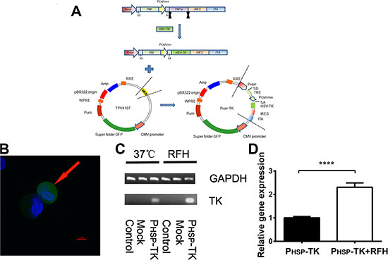 Figure 1: Construction of the PHSP-TK plasmid. (A) The PHSP-TK plasmid was constructed and transfected into MCF7/ADR cells, which showed GFP florescence (arrow on B) (80× magnification). (C) RT-PCR further confirmed successful PHSP-TK gene expression at either 37°C or 45°C RFH. (D) The 45°C RFH condition significantly enhanced PHSP-TK gene expression compared with that in the PHSP-TK-only group, ****p < 0.0001.