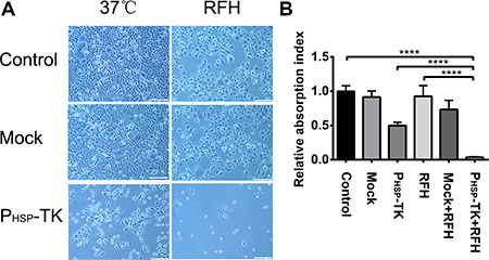 Figure 3: Results of in vitro experiments showing the cell phenotypes of MCF7/Adr after RFH-mediated gene therapy. (A) The cell killing effect of combination treatment with PHSP-TK + RFH was greater than those of other treatments. (10× magnification). (B) Results of the CCK8 cell proliferation assay, showing a significantly lower cell survival in the combination treatment group with PHSP-TK + RFH than in the other cell groups (****p < 0.0001). Scale bars = 200 um.