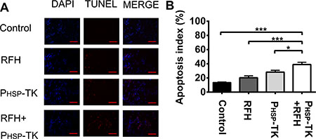 Figure 6: Apoptosis assay of tumor tissues. (A and B) TUNEL staining and quantification of apoptosis index showing a greater number of apoptotic cells in the PHSP-TK + RFH treatment group than in other three animal groups (***p < 0.001, *p < 0.05). Scale bars = 100 um.
