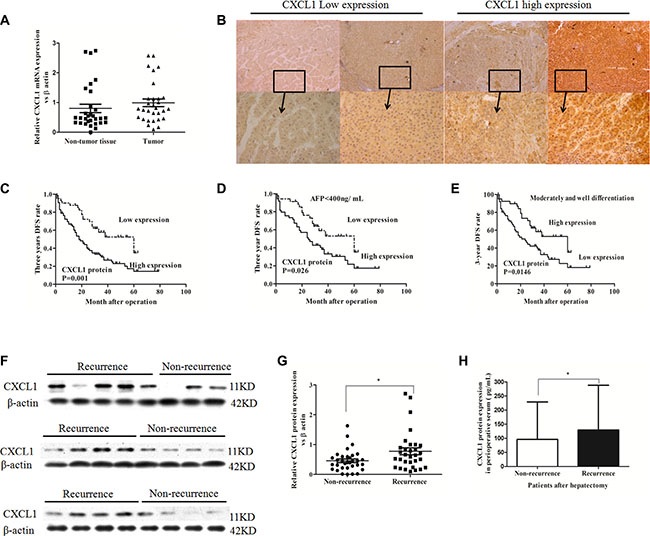 Figure 1: CXCL1 expression in HCC tumor and adjacent non-tumor tissues and association with recurrence. (A) Comparison of mRNA expression of CXCL1 between thirty frozen tumor tissues and paired adjacent non-tumor tissues from HCC patients (P > 0.05). (B) Low and high CXCL1 expression staining scores in HCC. Original magnification was ×50 and ×200. (C) Patients with low CXCL1 expression in HCC tissues had higher 3 year DFS rates than those with high CXCL1 expression. (D) In serum AFP < 400 ng/mL subgroup, patients with low CXCL1 expression in HCC tissues had better 3 year DFS rates than patients with high CXCL1 expression. (E) In moderately and well–differentiated tumor subgroups, patients with low CXCL1 expression had better prognosis in 3 year DFS rates than patients with high expression. (F) CXCL1 protein expression in frozen HCC tissues. (G) The level of CXCL1 protein expression in patients with recurrence at 3 years after hepatectomy was higher than those without recurrence, which was confirmed by immunoblotting (, non-parameter test). (H) The level of CXCL1 protein in perioperative serum from patients with recurrence at 3 year was higher than those without recurrence, as assessed by ELISA. *P < 0.05, **P < 0.01. Results were presented as the average (mean ± SD) representing the average of three independent experiments.