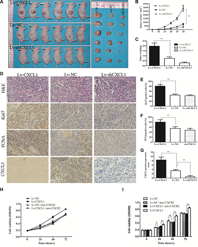 Figure 3: CXCL1 promoted tumorigenesis in a xenograft model. (A) Images of tumors which were induced by the injection of Lv-CXCL1, Lv-shCXCL1 or Lv-NC cells into nude mice (n = 6). (B, C) Growth curve and histogram of tumor weights in nude mice. Increasing CXCL1 expression contributed to tumor growth in nude mice. (D) Images of tumors samples which were stained with hematoxylin and eosin. The expression of CXCL1, Ki-67, and PCNA were measured by IHC staining. (E, F, G): Upregulation of CXCL1 increased the expression of Ki-67 and PCNA. (H, I) The effect of CXCL1 on HepG2 cell growth via the autocrine pathway could be blocked by adding CXCR2 antibody at 5 μg/mL for 1 h. Triplicate experiments were performed independently (mean ± SD). *P < 0.05, **P < 0.01.