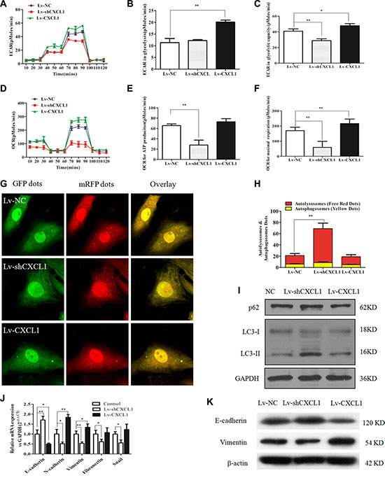 Figure 4: The effect of CXCL1 on mitochondrial respiration, autophagy and epithelial-mesenchymal transition (EMT). (A) ECAR curves in the Lv-CXCL1, Lv-shCXCL1, and NC groups. (B, C) Upregulating CXCL1 increased the level of glycolysis under normal conditions and the glycolytic capacity, while downregulating CXCL1 reduced the glycolytic capacity. (D) OCR curves in the Lv-CXCL1, Lv-shCXCL1, and NC groups. (E, F) CXCL1 enhanced the maximal respiration capacity, but not the level of ATP consumption under normal conditions, while inhibition of CXCL1 decreased both. (G, H) MRFP-GFP tandem fluorescent-tagged LC3 was employed to detect the effects of CXCL1 expression on autophagic flux under confocal microscopy. Yellow puncta represent autophagosomes, while red puncta represented autolysosomes. Decreasing CXCL1 expression induced more autophagic flux (**P < 0.01, one-way ANOVA) while no significant change was noted with increased CXCL1 expression. (I) Decreasing CXCL1 expression increased P62 levels and the ratio of LC3 II/LC3 I protein. (J, K) CXCL1 induced activation of the EMT pathway, while reducing CXCL1 suppressed this process as demonstrated by immunoblotting and qPCR. Three independent assays were performed (mean ± SD). *P < 0.05, **P < 0.01.