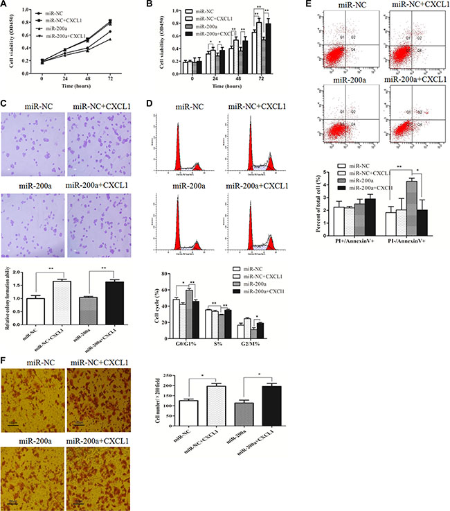 Figure 6: miR-200a inhibited HCC cell growth. (A, B) The growth of HepG2 cells was significantly inhibited after transfection with miR-200a in comparison to the negative control, and this was reversed by adding exogenous CXCL1 protein. (C) Upregulating miR-200a expression induced G0/G1 stage arrest and reduced the percentage of cells in S stage. (D) Increasing numbers of apoptotic cells apoptosis in early stages were induced by inserting the miR-200a mimic in HepG2 cells, was rescued by adding exogenous CXCL1 protein. (E) Overexpression of miR-200a did not have remarkable effects on colony numbers, based on the colony formation assay. (F) No significant differences were observed in the invasion assay when miR-200a was upregulated in HepG2 cells. Triplicate experiments were performed independently (mean ± SD). *P < 0.05, **P < 0.01.