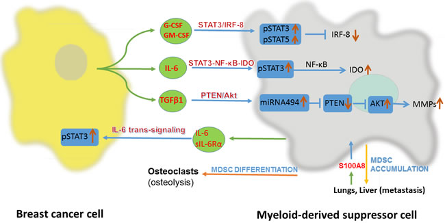 20. Oh K, Lee OY, Shon SY, Nam O, Ryu PM, Seo MW and Lee DS. A mutual activation loop between breast cancer cells and myeloid-derived suppressor cells facilitates spontaneous metastasis through IL-6 trans-signaling in a murine model. BCR. 2013; 15:R79.