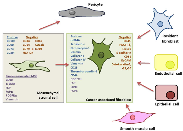 FAP, α-SMA (Immunostaining) PDGFR- α positive, CD45 negative (Flow cytometry) |